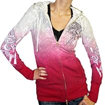 Christian Audigier has quickly become Rock Royalty through the tattoo designs of Ed Hardy. Celebrate who you are with this regal rock and roll with soul zip up hoodie! This dip dyed white, pink, and fuchsia cotton hoodie features a tonal all over tattoo design. The front has a printed picture of a dragon adorned with black and pink rhinestones and outlined with metallic stitch detailing. The Ed Hardy by Christian Audigier logo is embroidered on one of the pockets, as well as on the hood, both in metallic silver. Both sleeves depict the dragon design, only without the rhinestones. The back features the same design as the front only larger. Long, tunic-style zip up hoodie made with 5% spandex for comfortable fit! Style #A9ZVHAHJ. Fuchsia.